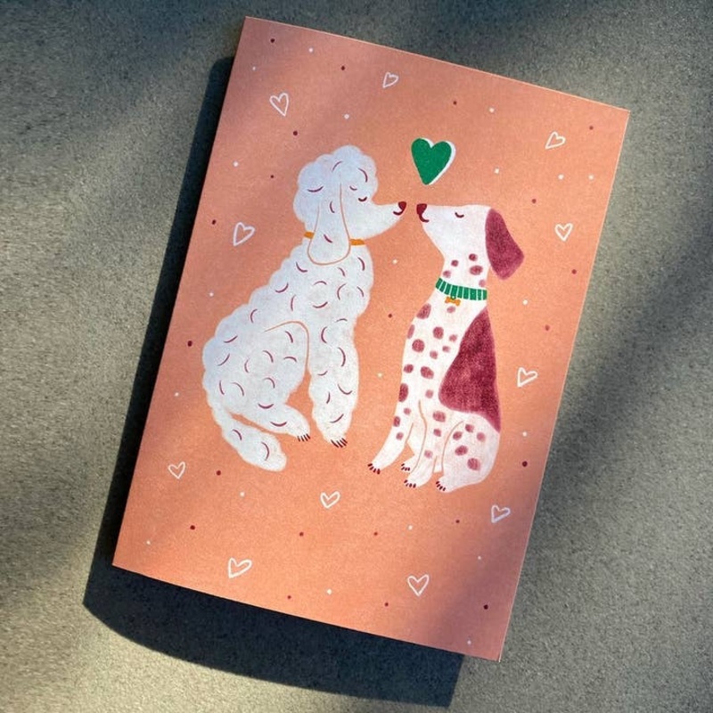 Two pups in love - this greeting card features a pair of dogs sharing a kiss. Set on a peachy background with mini hearts surrounding them, this card is perfect for a loved one, Valentines Day or an Anniversary celebration. Blank inside for a personal mess
