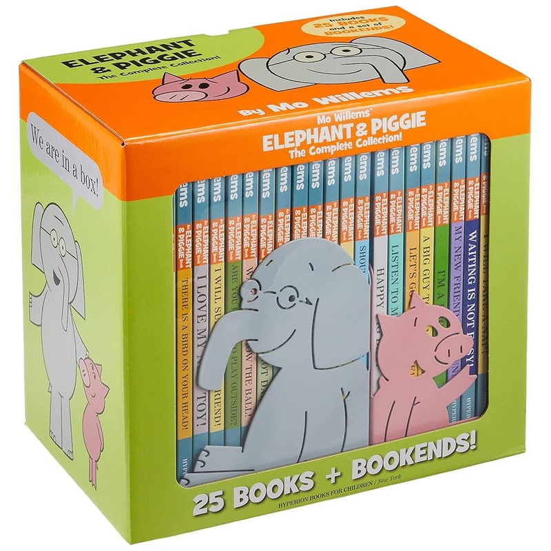 The Elephant & Piggie: The Complete Collection by Mo Willems is a delightful boxed set featuring all 25 books in the beloved series. Ideal for children aged 48, these stories follow the humorous adventures of Gerald the cautious elephant and Piggie the exuberant pig, highlighting themes of friendship, empathy, and fun. Each hardcover book is designed to engage early readers with expressive illustrations and simple, conversational text. The set also includes two sturdy metal bookends shaped like the characters, making it a charming and functional addition to any child’s bookshelf.