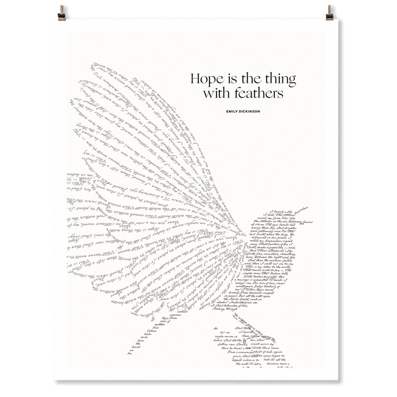 “Hope is the thing with feathers”-Emily DickinsonFor this illustration, we used Emily Dickinson’s own words as line elements to create the “thing with feathers” she describes in this extraordinary poem. The source of hope she depicts is a bottomless well of creative inspiration and strength, which for her manifested in poetry. Visually, her handwriting is a remarkable combination of beautiful flourishes and swooshes combined with an almost frantic energy – a pen racing to keep up with a quicksilver mind. 11×14 inch art print with white border Premium, fine art paper made in New York Elegant eggshell finish Fits into standard 11×14 frames (or a 16×20 frame matted to 11×14)