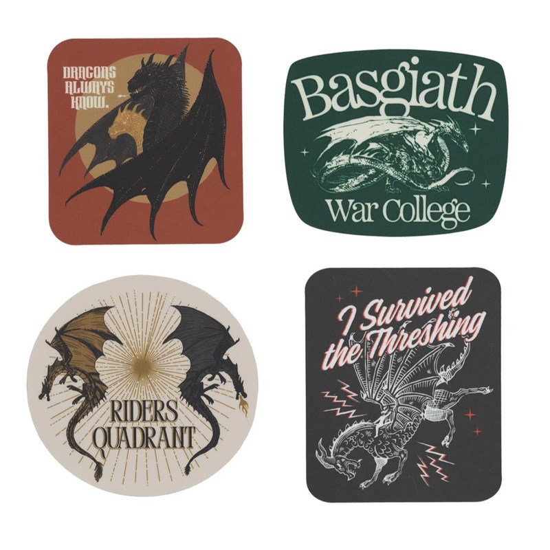 From the officialOut of Print x Fourth Wingcollection - Dive into the world of Fourth Wing with this Dragon Rider Stickers - Set of 4. This collection of high-quality stickers is perfect for fans of Rebecca Yarros's Empyrean series. The set includes imager