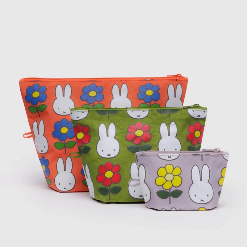 The Baggu Go Pouch Set makes it easy to keep your bag neatly packed and organized. Whatever you’re totingcoins, cords, or an extra pair of shoesthis set of three all purpose pouches keeps it together. They expand to hold your essentials and lay flat when not in use.