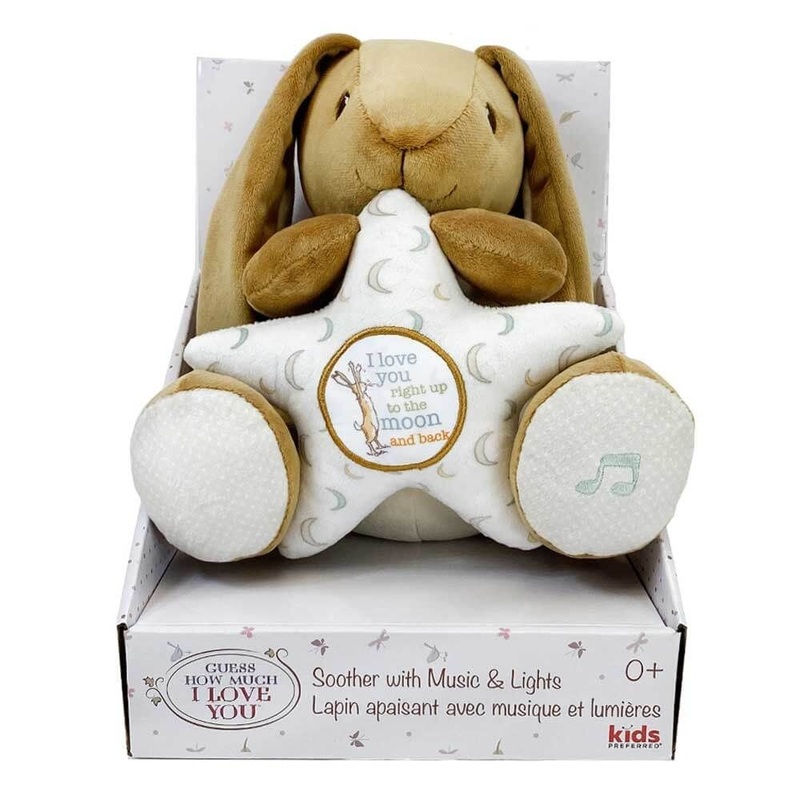 This adorable animated plush from Guess How Much I Love You features soft fabric and makes an enchanting gift for babies and young children. Press the rabbits foot to activate the music and lights. Requires 3 x AAA batteries (included).