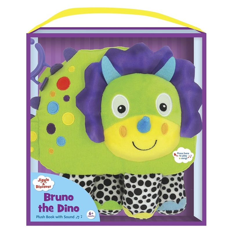 There was a dino long ago and Bruno was his nameo!Babies and toddlers will love to follow along to Bruno the Dino (sung to the tune of BINGO) in a specially designed soft cloth book with whimsical illustrations and a lively melody. This adorable plush book
