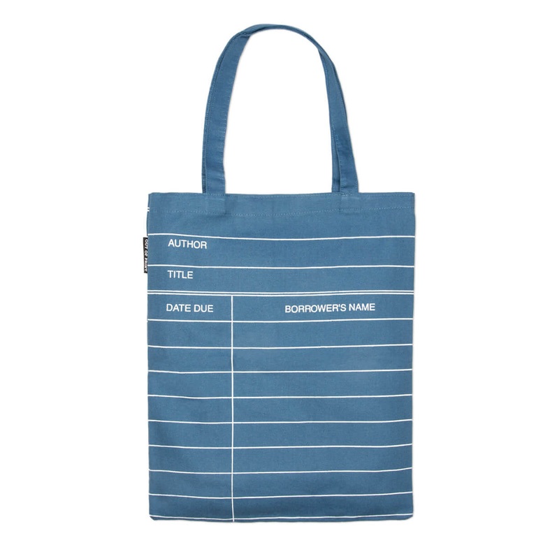 Express your love for libraries with this original library card tote bag. Product Details:100% cotton canvasColour: blueInner pocketFlat tote15" w x 17" h11" canvas strap (hanging)Made in the USA for Out of Print
