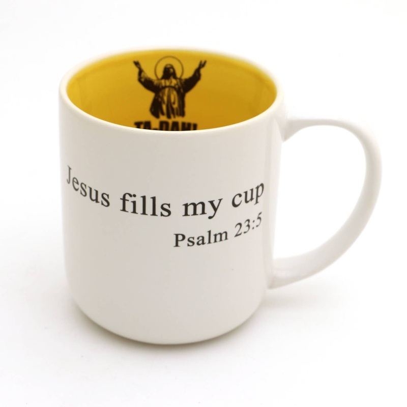 Ta-Dah! It's Jesus! This mug reads: Jesus fills my cup Pslam 23:5 on the front, and then features my homage to JC inside on a sunshine yellow interior. The back reads: WAKE PRAY SLAY- great advice for how to have a wonderful day! Great gift for a Godparent