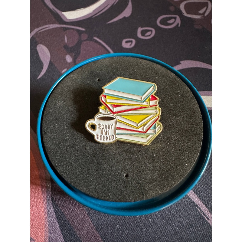 Sorry, I’m Booked enamel pin. Books and coffee. Comes packaged, ready for branding.