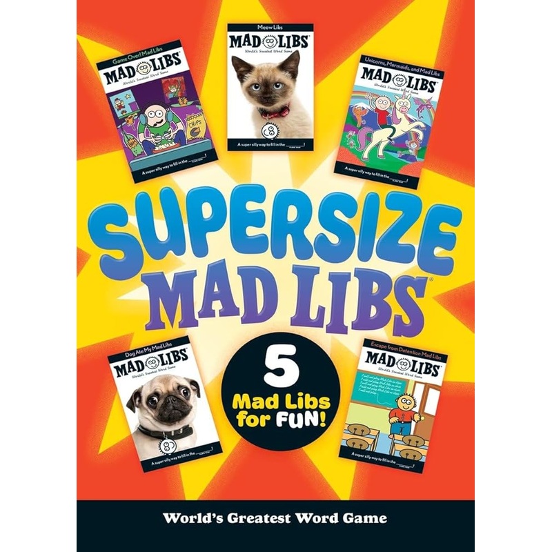 – Five complete Mad Libs books in one collection: Unicorns, Mermaids, and Mad Libs; Dog Ate My Mad Libs; Meow Libs; Game Over! Mad Libs; Escape from Detention Mad Libs