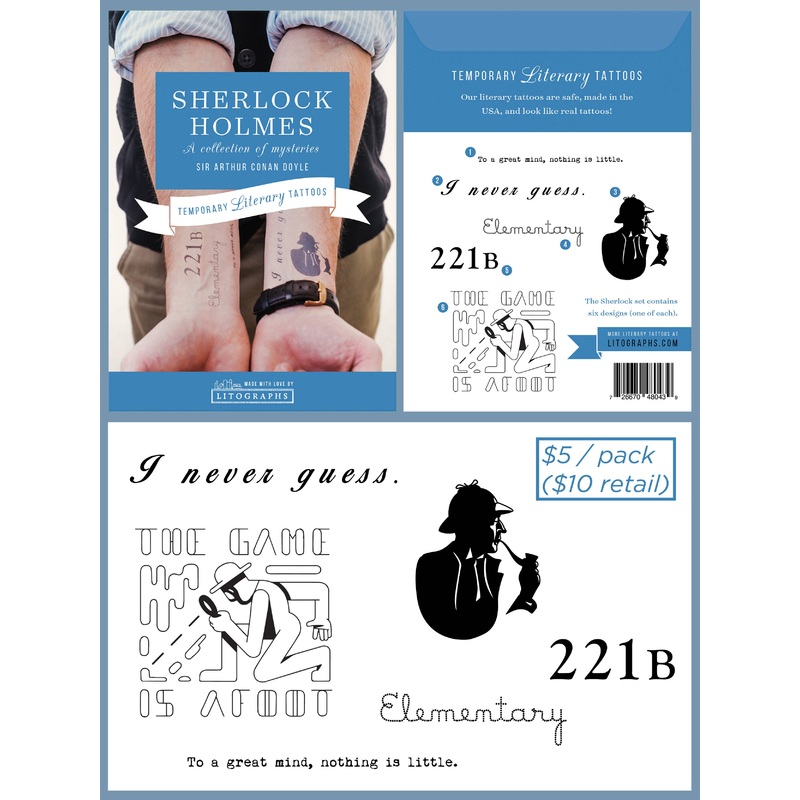 At Litographs, we create art from books. Each temporary tattoo pack includes six tattoos, featuring illustrations and quotes from a classic book. Litographs temporary tattoos are designed to be realistic, both in terms of their artwork and the way they look once applied. Each tattoo is one of three sizes: 3″ x 3″, 2″ x 3″, or 1″ x 4″. They last 1-3 days, and are easily applied using a wet cloth.Any order of 30 packs or more qualifies for a free countertop display (13 wide x 12 deep x 16 tall). Orders are batched on Sunday mornings and fulfilled the following week. Please feel free to message us with any questions.